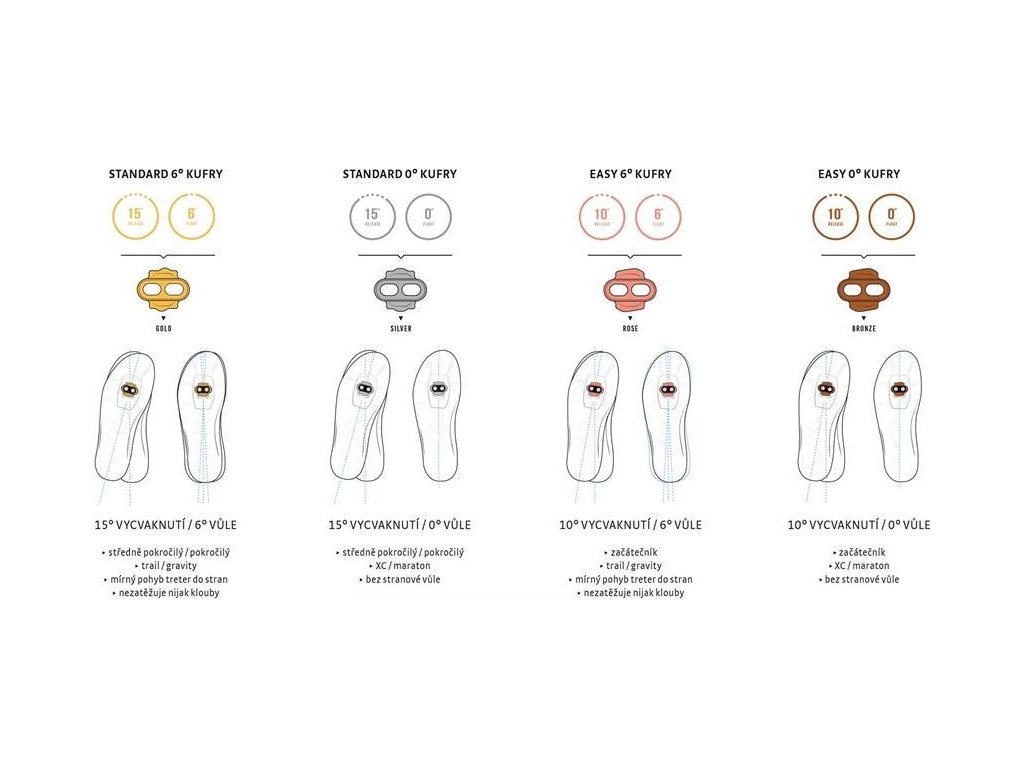 Kufry s menším úhlem vycvaknutí (10°) jsou vhodné po začátečníky, umožňují totiž dřívější vycvaknutí nohy z pedálu. Provedení se stranovou vůlí 6° nezatěžuje kolenní klouby.