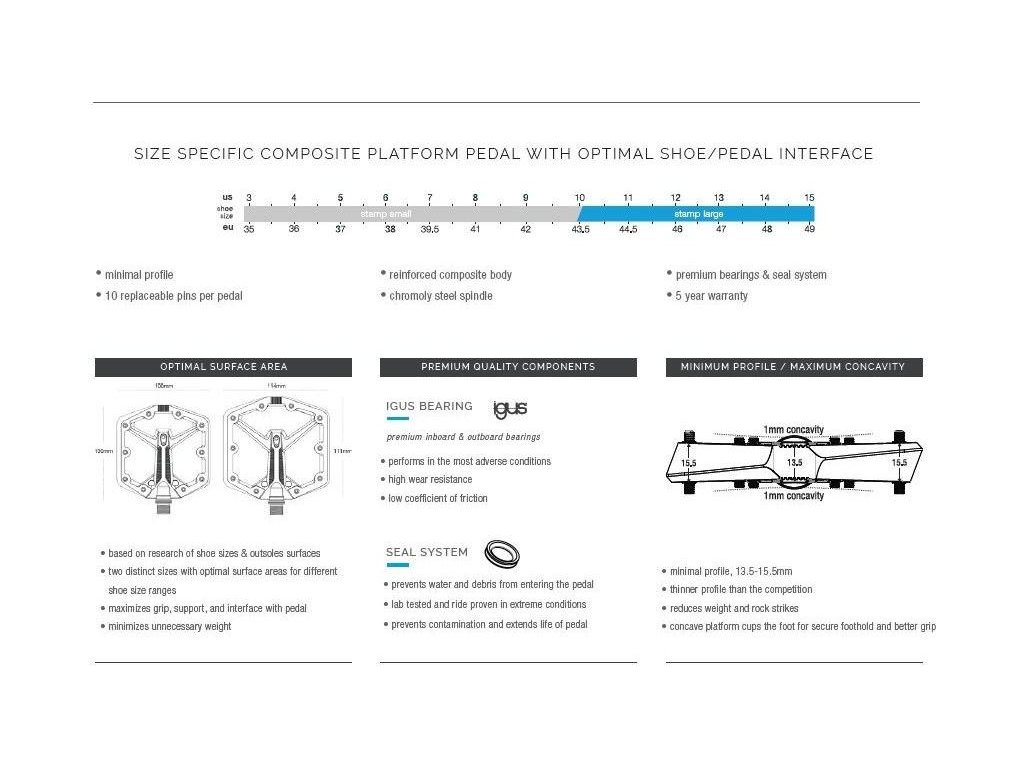 Je tu nová generace nejoblíbenějšího platformového pedálu z Kalifornie! Nové pedály Stamp 1 staví na odkazu celé rodiny pedálů Stamp a představují konkávní platformu pro větší jistotu na trailu, prověřené vnitrřní komponenty z pedálu Stamp 7 pro skvělou odolnost a životnost a nový jednodílný design pinů pro co největší grip a jejich snadnou výměnu!
