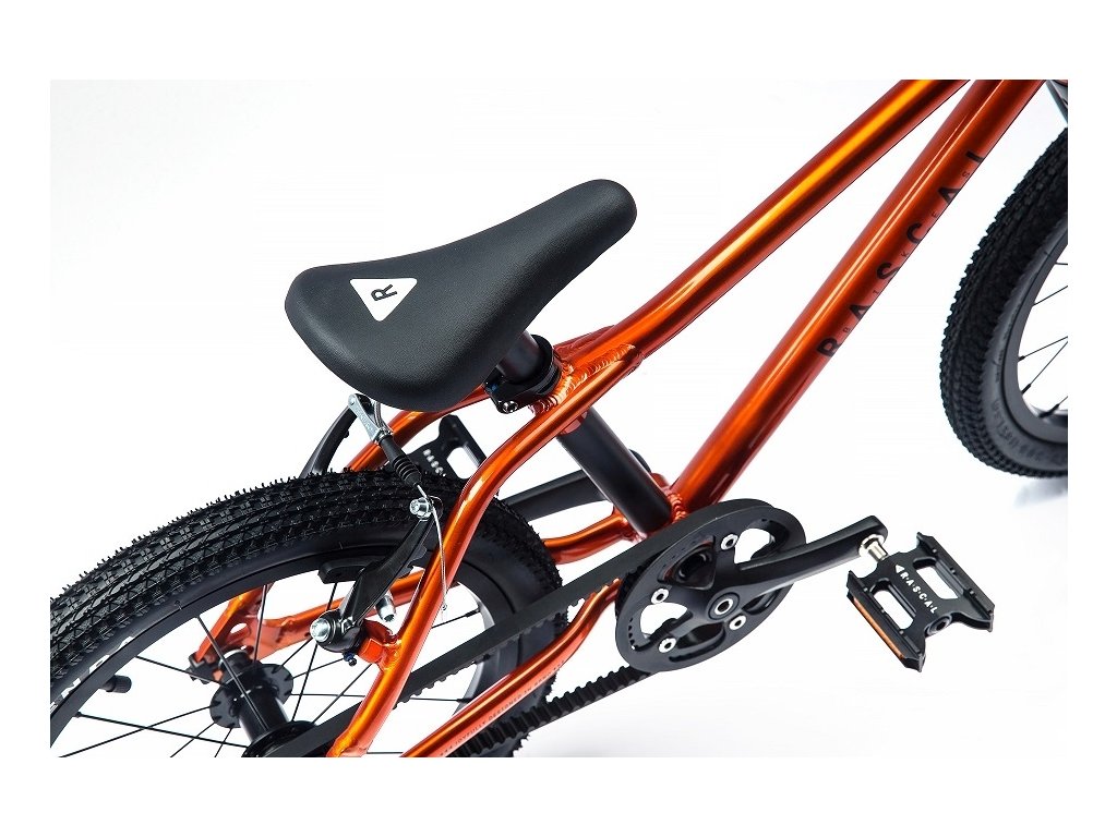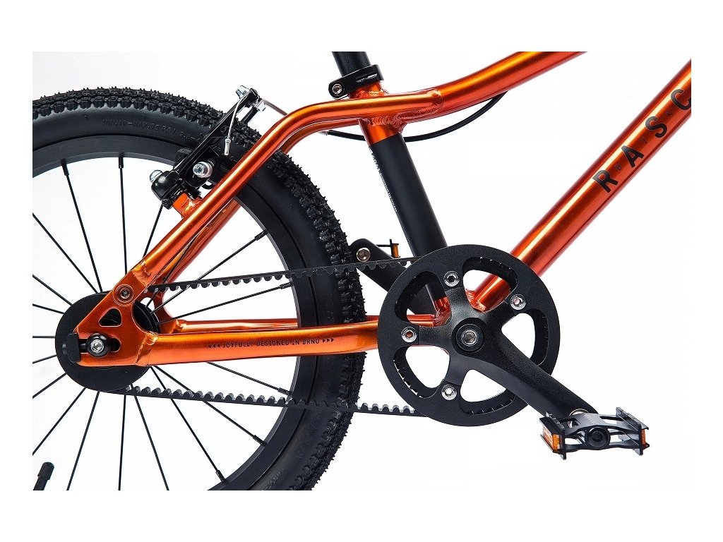 Model Rascal 14 staví na lehkém hliníkovém rámu s dětskou geometrií, řemenovém pohonu a zúžené zadní stavbě i vidlici. Jedná se o klíčová technologická řešení, díky kterým si vaše dítě jízdu na kole velmi rychle osvojí a zamiluje.