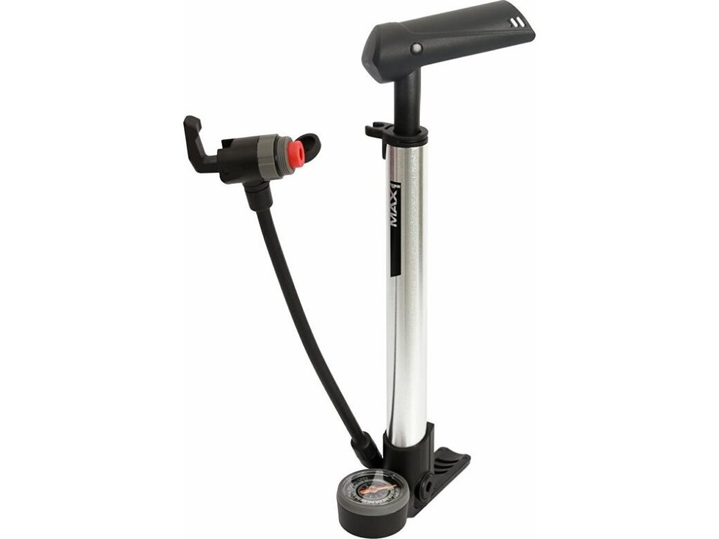 malá cestovní nožní hustilka MAX1 Touring Evo s Alu barelem a manometrem pro přesné určení tlaku, výklopné madlo a podstavec