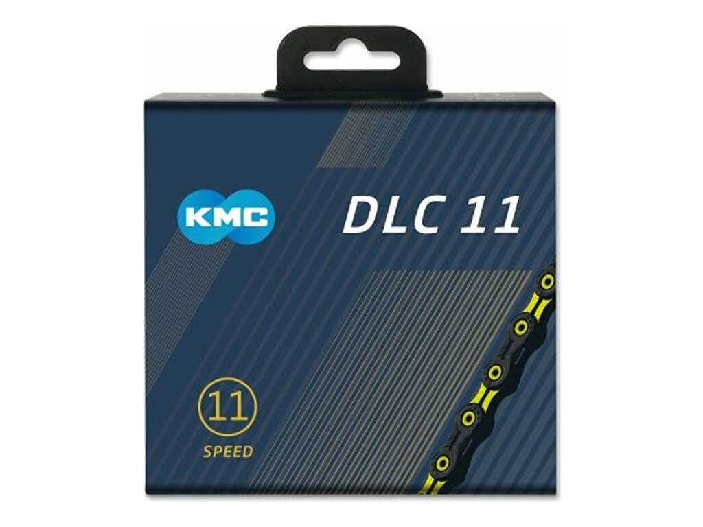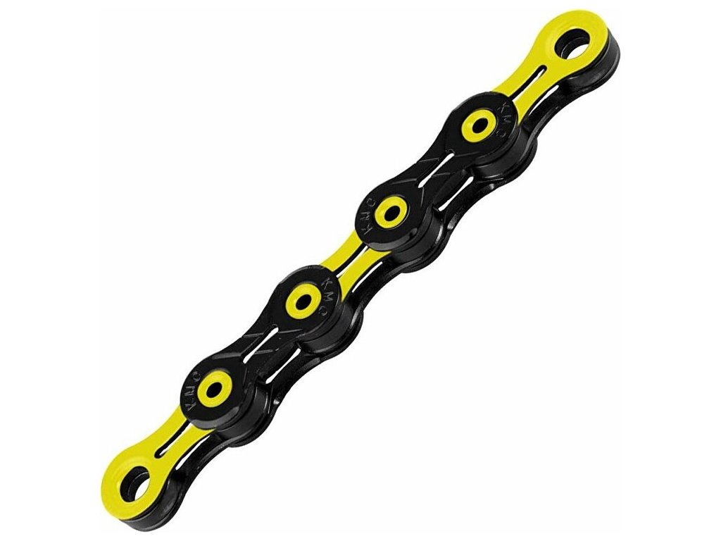 řetěz KMC DLC 11 žluto/černý, vhodný na řazení Shimano/Sram/Campa, nesměrový, 118 článků, úprava Superlight DLC, včetně spojky