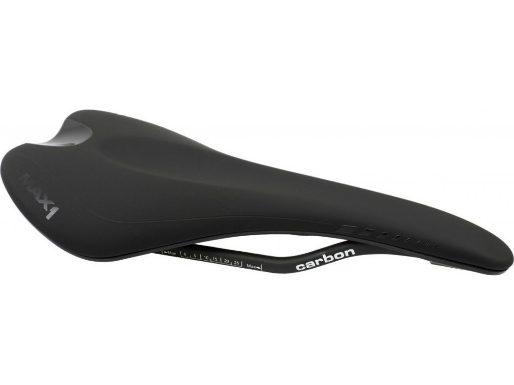 Závodní sedlo MAX1 Evo s karbnovými ližinami a karbonovou platformou.